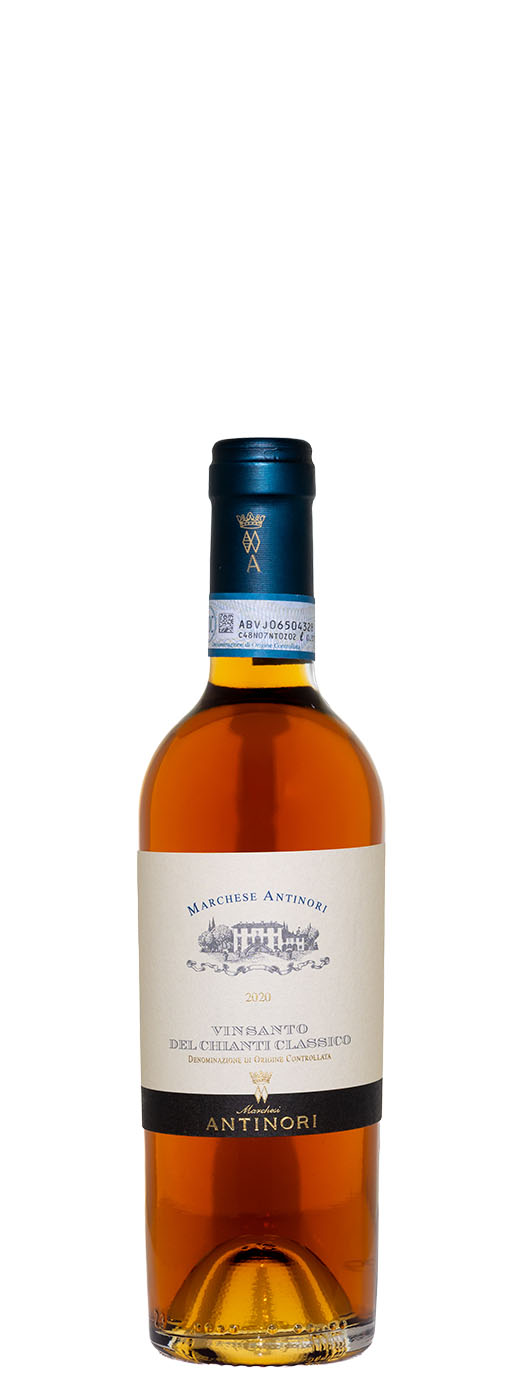 Vinsanto Marchese Antinori is deep amber in color with golden highlights. On the nose sweet notes of dried fruit, hazelnuts and dates, blend with intense sensations of candied orange, honey and a slight hint of cinnamon. The palate is full, supple, backed up by a pleasant freshness that makes it vibrant and pleasurable. Enjoyable persistence of flavors.